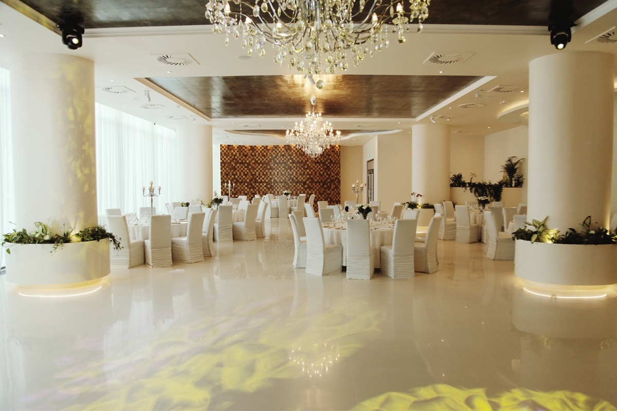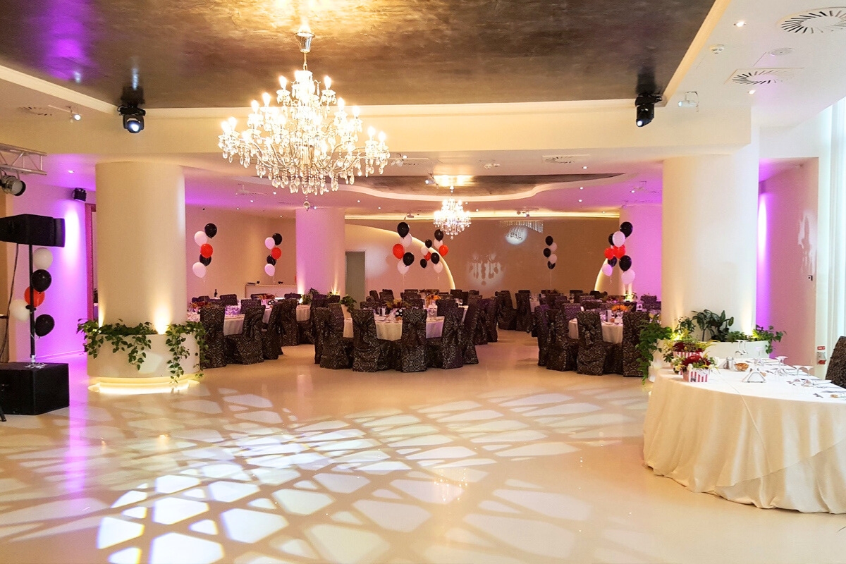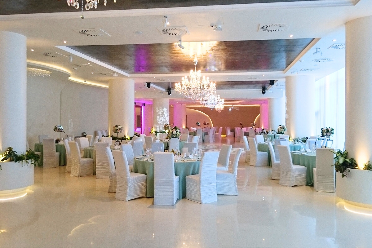Sala de evenimente are suprafata neta de 400 mp, asigura o capacitatea maxima este de 220 persoane, dispuse la mese rotunde de cate 10-12 persoane, ramanand loc suficient pentru un ring de dans generos.